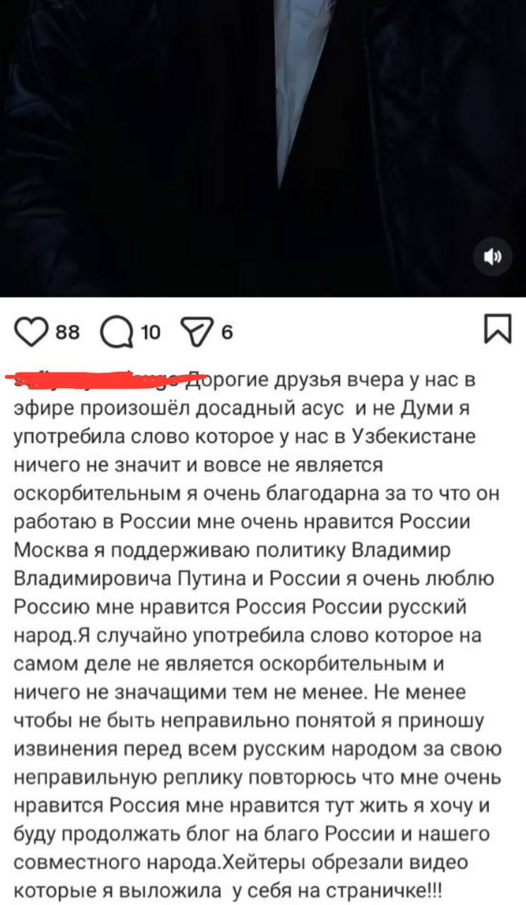 Узбечка Дилфуза, подрабатывающая в столице водителем такси, проехала по Красной площади и сняла на видео росгвардейцев, назвав их по-узбекски «хароми» – нечистью. Видео она с гордостью выложила в свои соцсети, а после критики стала оправдываться. Дескать, это слово вовсе не ругательное, и вообще она любит нашу страну, президента Путина, хочет здесь жить и работать.
