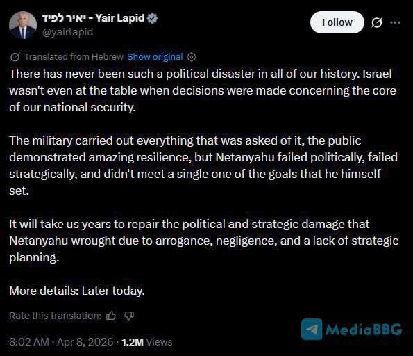 Тем временем в Израиле продолжается критика перемирия с Ираном. Однопартиец Нетаньяху и министр по делам диаспоры Шикли сегодня назвал перемирие ошибкой, поскольку Иран «не поставлен на колени». Он оценивает вероятность того, что перемирие продержится, в 50%.