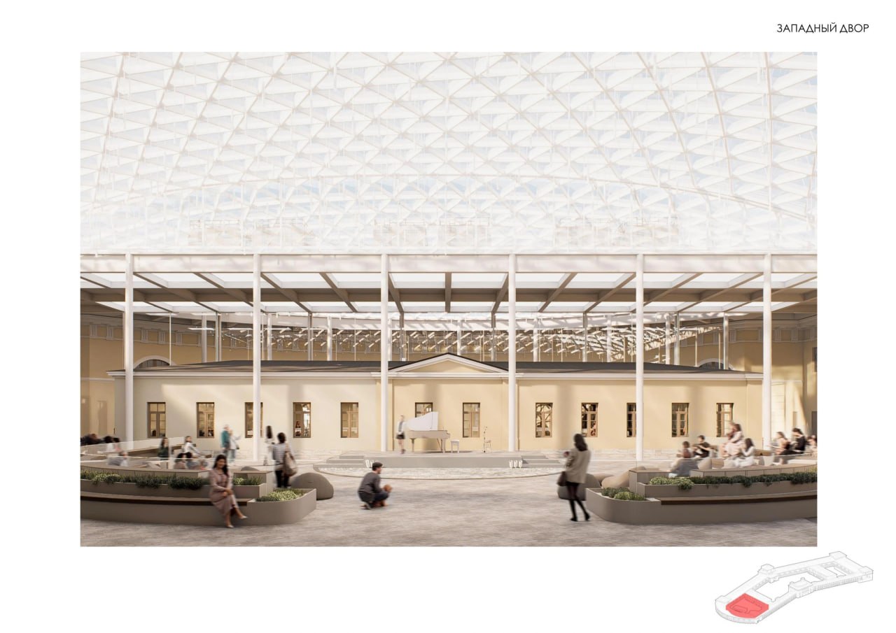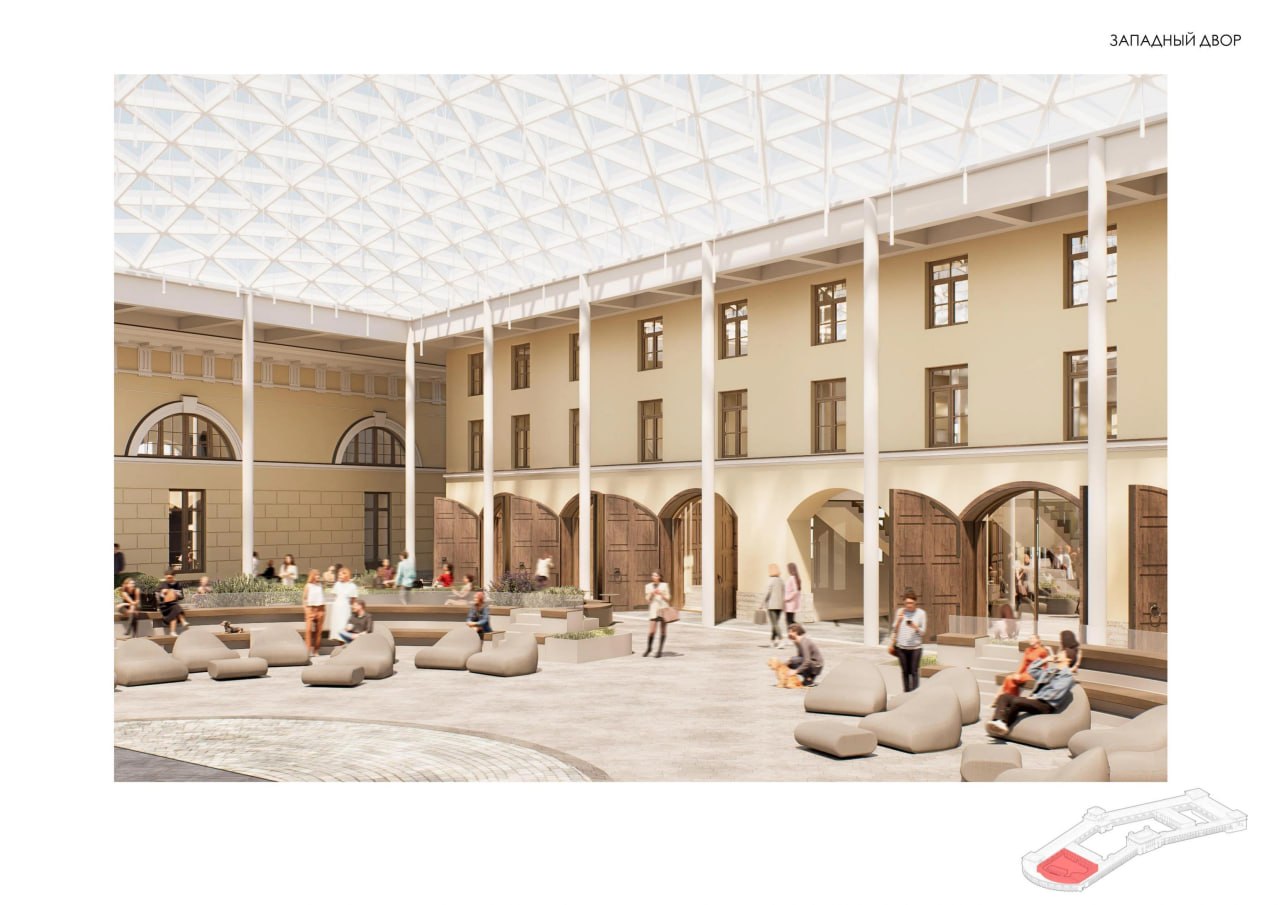 Двор Конюшенного ведомства станет частью пешеходного променада за счёт сквозных проходов. Зимой там будут заливать каток. Два внутридворовых флигеля восстановят в исторических габаритах, в самом здании откроются выставочные залы и заведения общепита.
