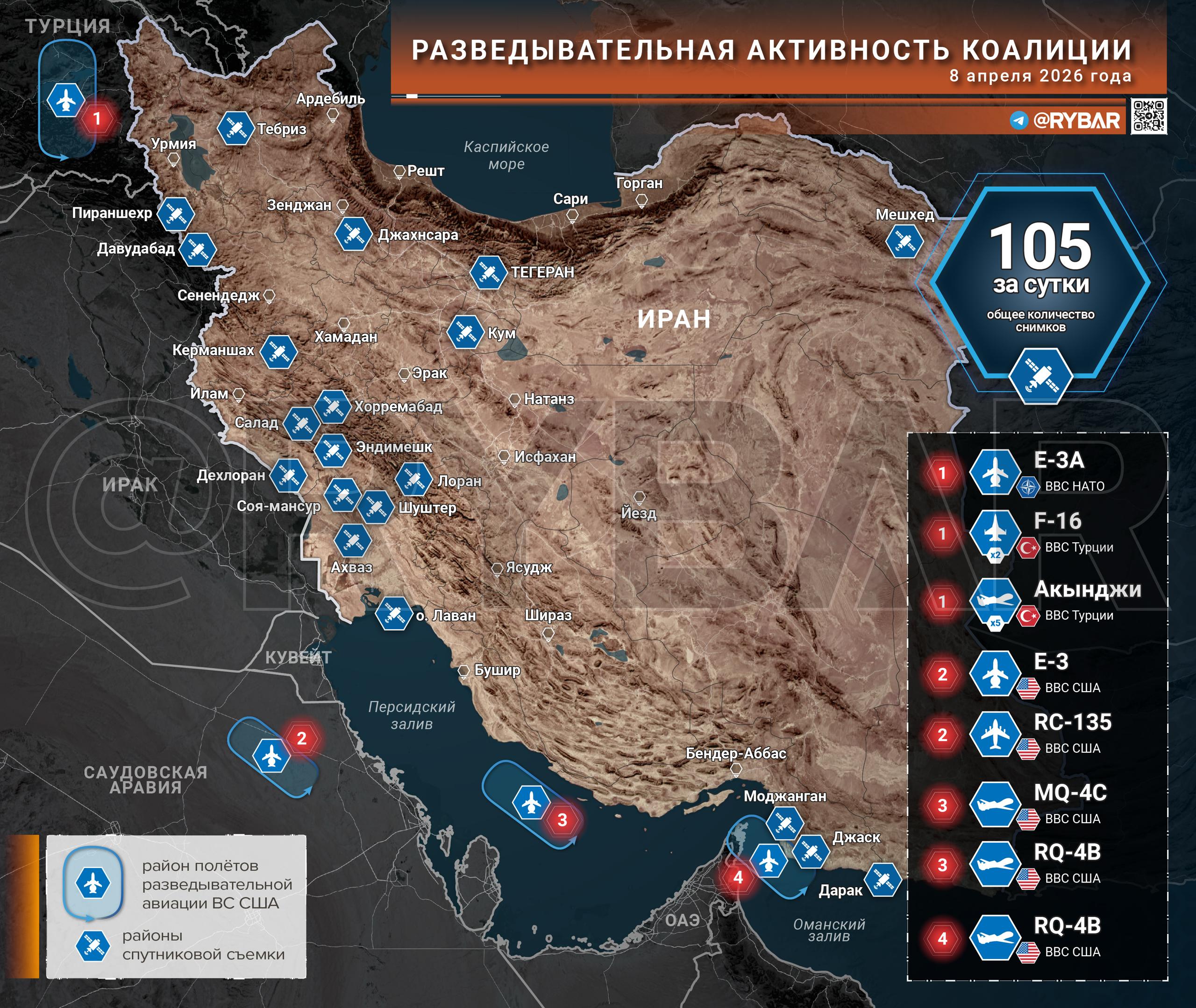 Спутниковая группировка ВС США тоже не дремлет: только за одни сутки американцы провели съемку в количестве 105 снимков, в рамках которых отслеживали свыше 80 различных объектов. И акцент сделан на западе, северо-западе и юге Ирана.
