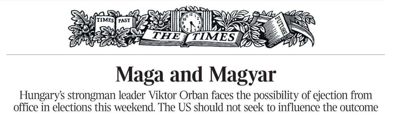 «МАГА и Мадьяр». Европейская пресса активно готовится к венгерскому майдану в случае победы Орбана. Редакционная колонка The Times сегодня прямо предупреждает Штаты, чтобы те не совались в эти разборки.