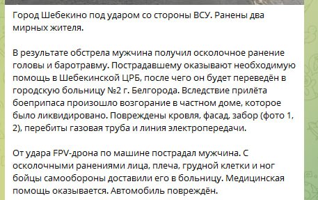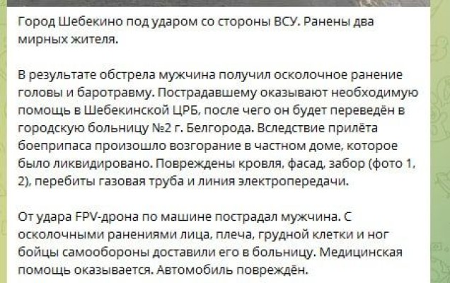 Губернатор Белгородской области сообщает об атаке ВСУ на мирных жителей - ранены два человека, им оказывают необходимую помощь.