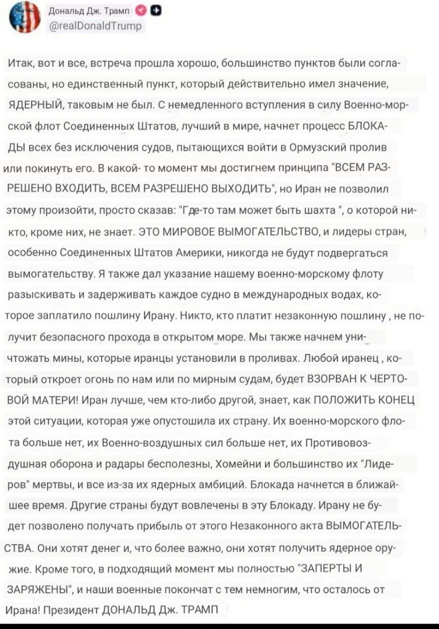 «Я поручил нашим ВМС выявлять и перехватывать каждое судно в международных водах, которое уплатило пошлину Ирану. Никто, кто уплачивает незаконную пошлину, не будет иметь безопасного прохода в открытом море. Мы также начнем...