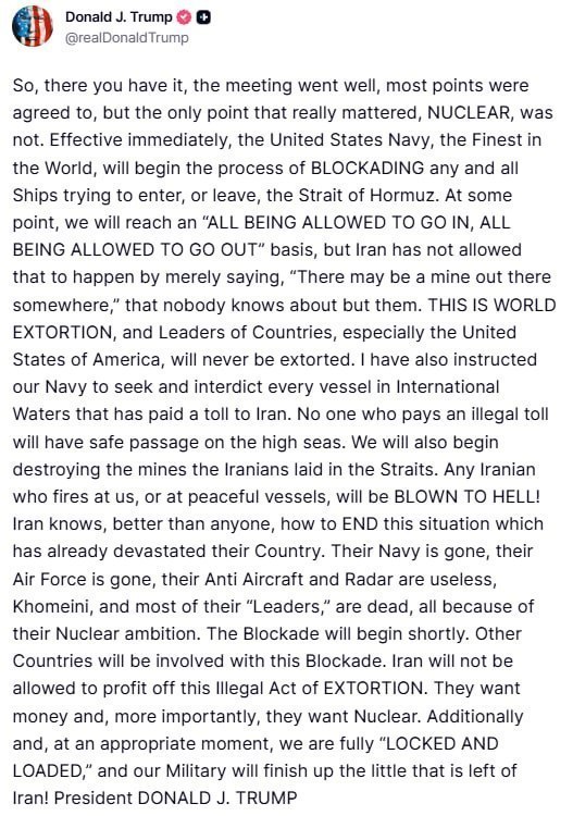 «С этого момента ВМС США начинают процесс блокирования любых судов, пытающихся войти или выйти из Ормузского пролива»,
