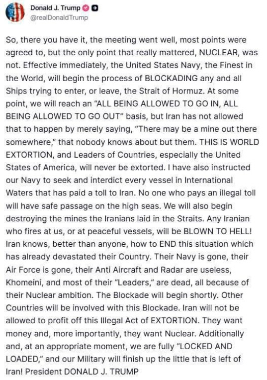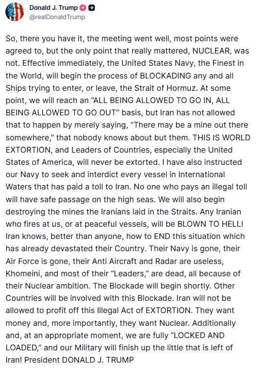 «Итак, вот как всё прошло — встреча прошла хорошо, большинство пунктов были согласованы, но единственный пункт, который действительно имел значение, — ЯДЕРНЫЙ — согласован не был. Немедленно и с этого момента ВМФ США, Лучший в Мире, приступит к процессу БЛОКАДЫ всех без исключения судов, пытающихся войти в Ормузский пролив или выйти из него. В какой-то момент мы перейдём к принципу "ВСЕМ РАЗРЕШАЕТСЯ ВХОДИТЬ, ВСЕМ РАЗРЕШАЕТСЯ ВЫХОДИТЬ", однако Иран не позволяет этому произойти, просто заявив: "Где-то там может быть мина", о которой не знает никто, кроме них. ЭТО ВЫМОГАТЕЛЬСТВО В МИРОВОМ МАСШТАБЕ, и лидеры стран, прежде всего Соединённых Штатов Америки, никогда не поддадутся шантажу.Я также поручил нашему флоту выявлять и перехватывать в международных водах каждое судно, уплатившее пошлину Ирану. Никто, кто платит незаконный сбор, не будет иметь безопасного прохода в открытом море. Мы также приступим к уничтожению мин, которые иранцы заложили в проливе. Любой иранец, который откроет огонь по нам или по мирным судам, будет УНИЧТОЖЕН!
