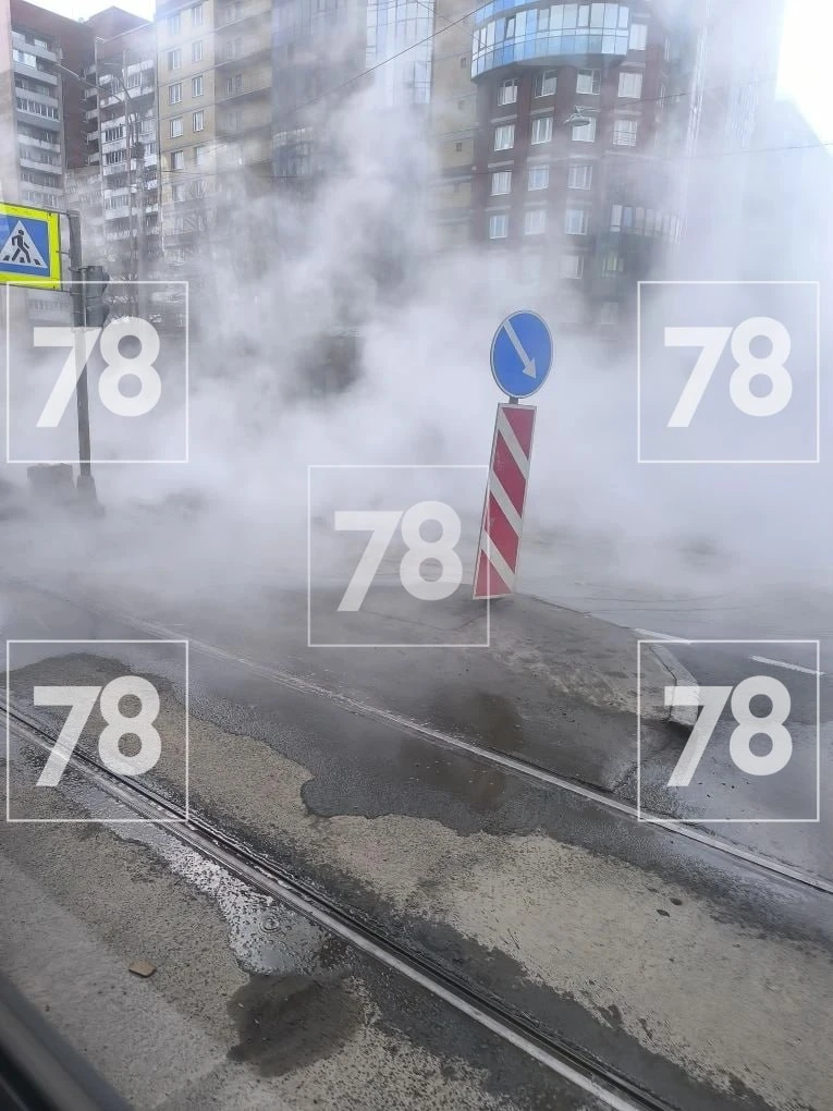 Пар окутал перекрёсток проспекта Испытателей и Серебристого бульвара