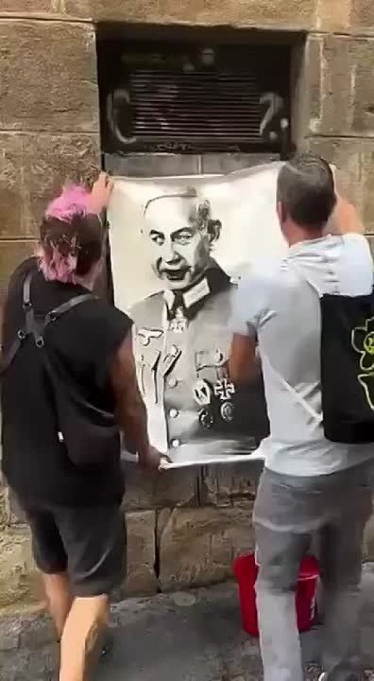 На кадрах... В Испании начали развешивать плакаты на улицах с надписью «Гитлер Нетаньяху». Противостояние в регионе нарастает.