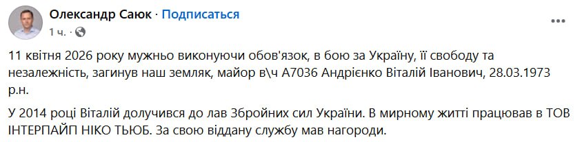 11 апреля 2026 года на Запорожском направлении ликвидирован офицер 108-й отдельной бригады территориальной обороны майор Андриенко Виталий Иванович