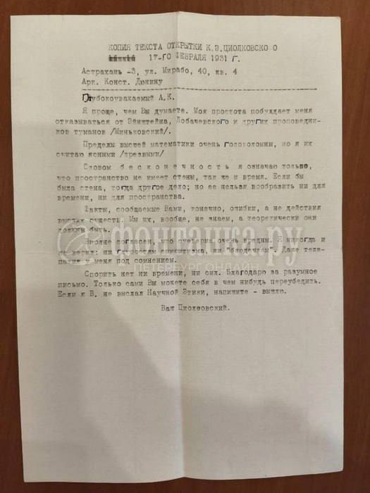 После публикации «Фонтанки» письмо Константина Циолковского выкупили на аукционе и передали в дар 521 петербургской школе.