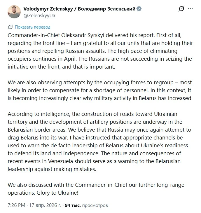 ‘По данным разведки, в приграничных районах Белоруссии ведется строительство дорог в сторону украинской территории и обустройство артиллерийских позиций. Мы считаем, что Россия может вновь попытаться втянуть Белоруссию в свою войну. Я дал указание использовать соответствующие каналы, чтобы предупредить де-факто руководство Белоруссии о готовности Украины защищать свою землю и независимость. Характер и последствия недавних событий в Венесуэле должны послужить предупреждением белорусскому руководству о недопустимости ошибок’.