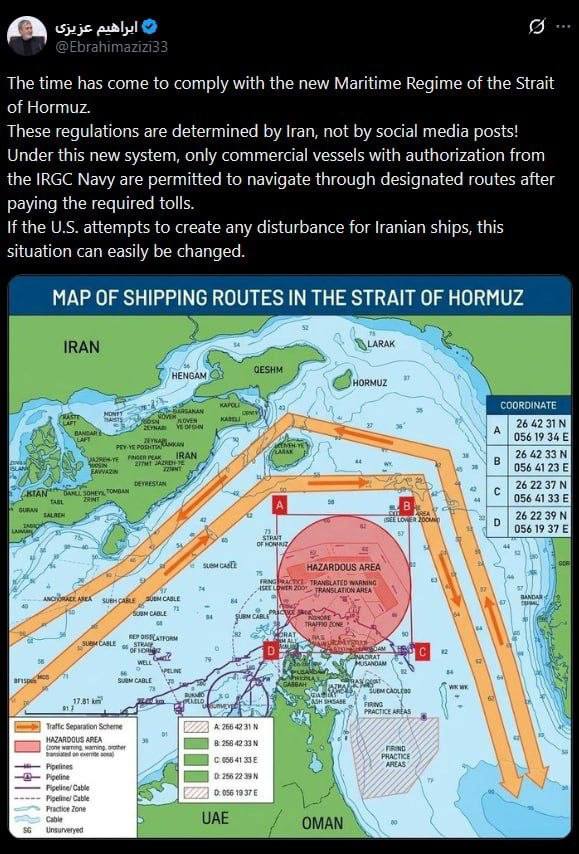 Трамп снова оказался в неловкой ситуации, «открыв» Ормузский пролив без подтверждения со стороны Тегерана. Оказалось, что информация – «свободно и бесплатно» – не соответствует действительности. Глава комиссии по безопасности Эбрахим Азизи подтвердил, что продолжает действовать новый морской режим.