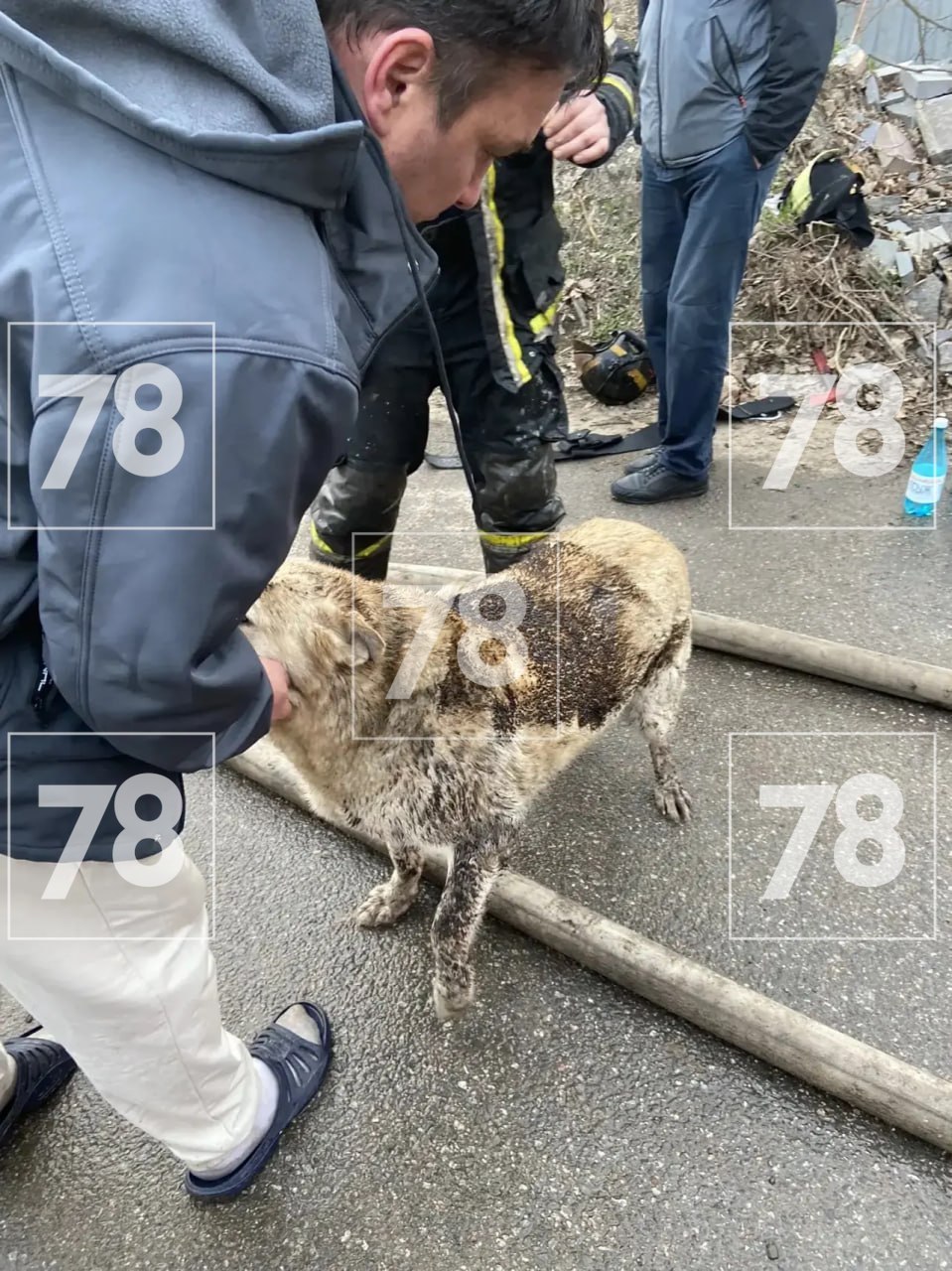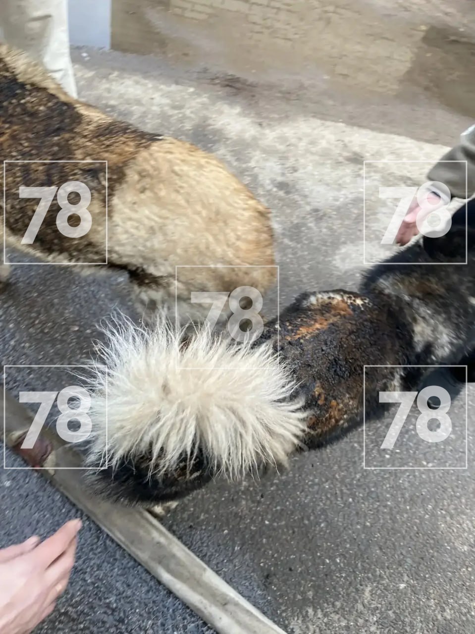 «Пожарными было принято решение отбивать эту лестницу и вытаскивать оттуда собак, что, в принципе, они и сделали. У собак обгорела шерсть, то есть до мяса не достало. Видимых таких повреждений, кроме опала, нет»,