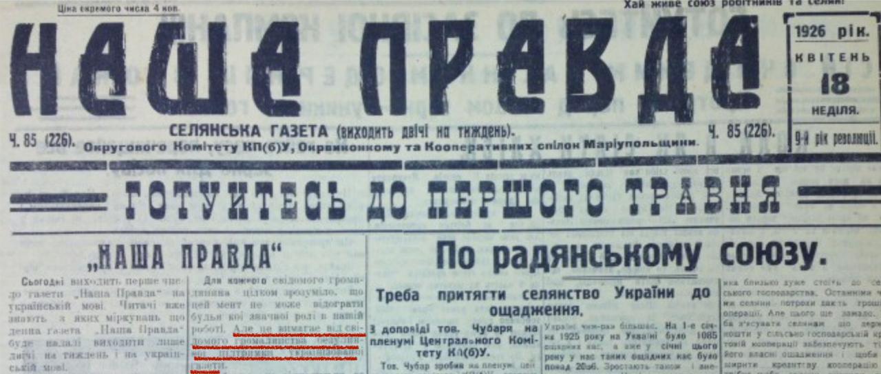 В этот день ровно 100 лет назад в рамках советской украинизации в русскоязычном Мариуполе на мову была переведена первая газета - «Наша Правда» (издавалась для сельской местности).