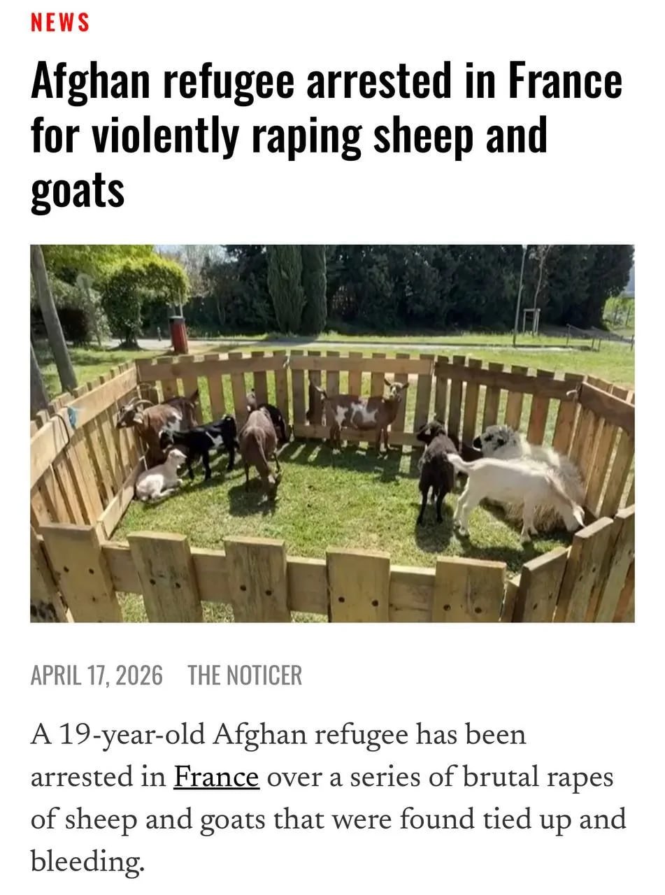 19-летний афганец насиловал на пастбищах овец и коз, связывая их конечности, дело происходит во Франции.