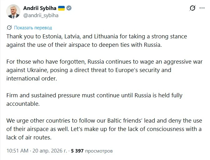 ‘Спасибо Эстонии, Латвии и Литве за твёрдую позицию против использования их воздушного пространства. Мы призываем другие страны последовать примеру наших балтийских друзей и также запретить России использование их воздушного пространства’.