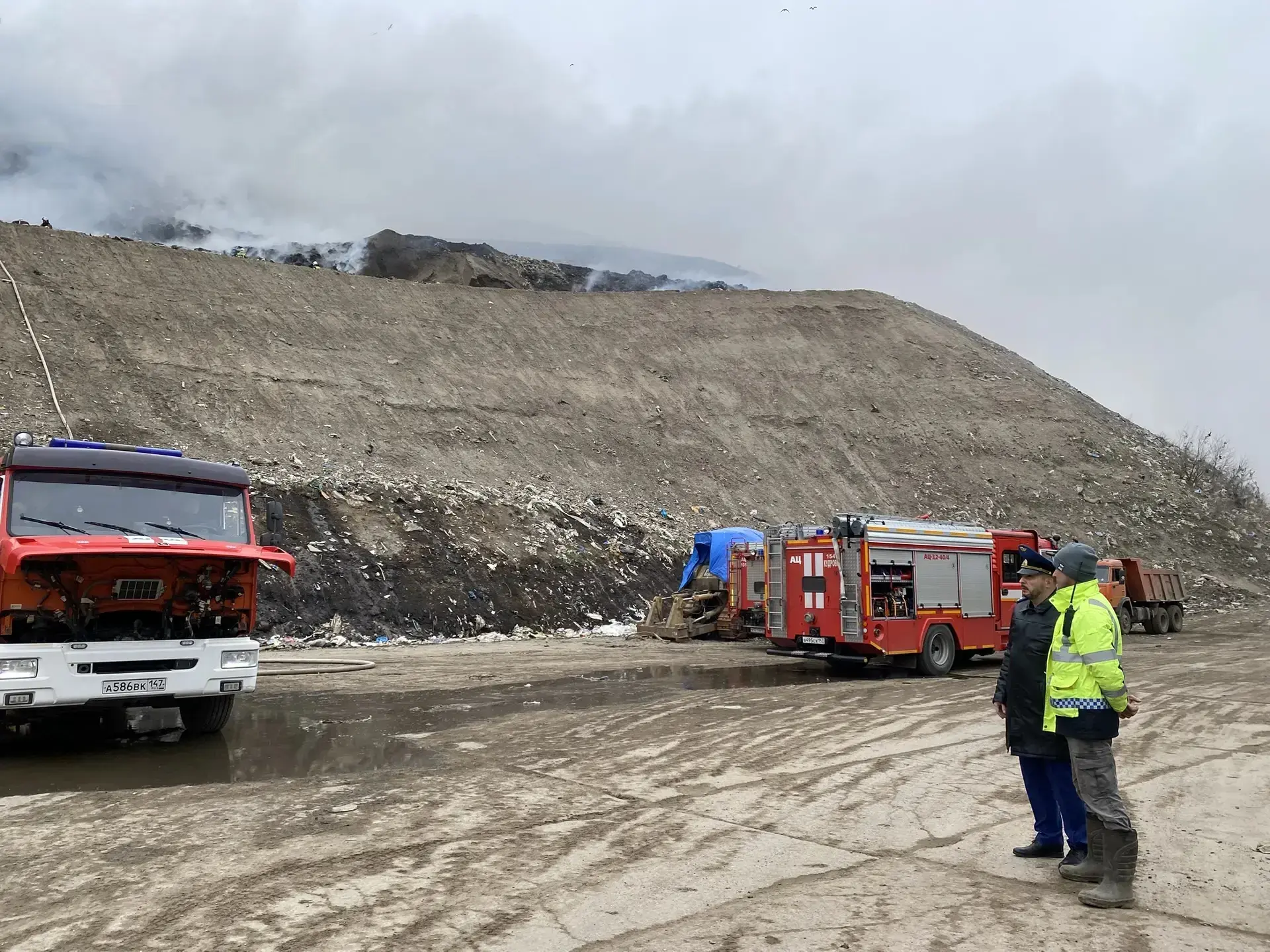 МЧС сообщает, что мусор на полигоне тлеет на площади 1500 «квадратов». Спасатели работают над локализацией пожара, причины возгорания выясняются. Пострадавших нет.