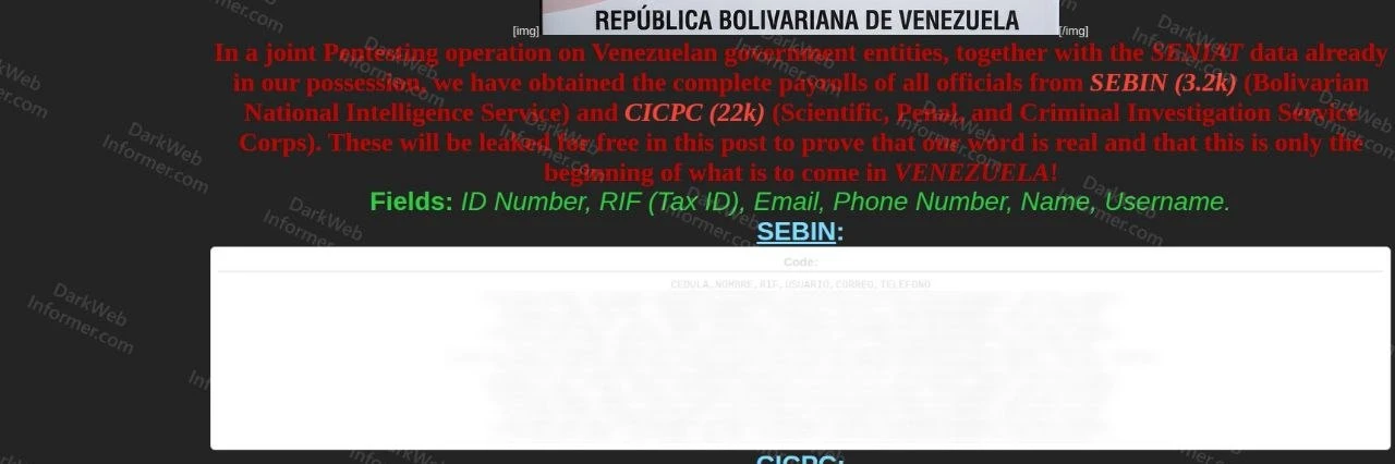 В Венесуэле назревает скандал с утечкой секретной информации. Хакеры заявили о взломе баз двух силовых структур страны — Национальной разведывательной службы (SEBIN) и Корпуса уголовных расследований (CICPC).