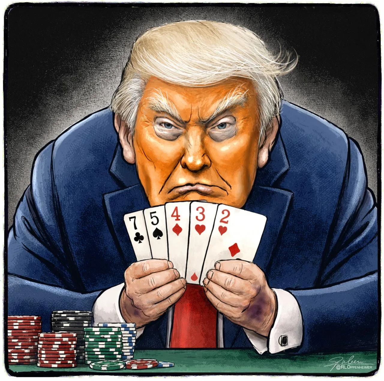 Нидерландская газета NRC красочнее всех проиллюстрировала позицию Трампа в переговорах по Ормузскому проливу. Ему удается сохранять «покер-фейс», держа при этом свои карты открытыми.
