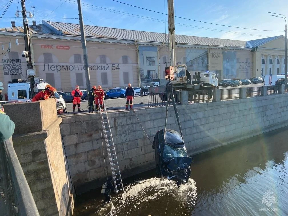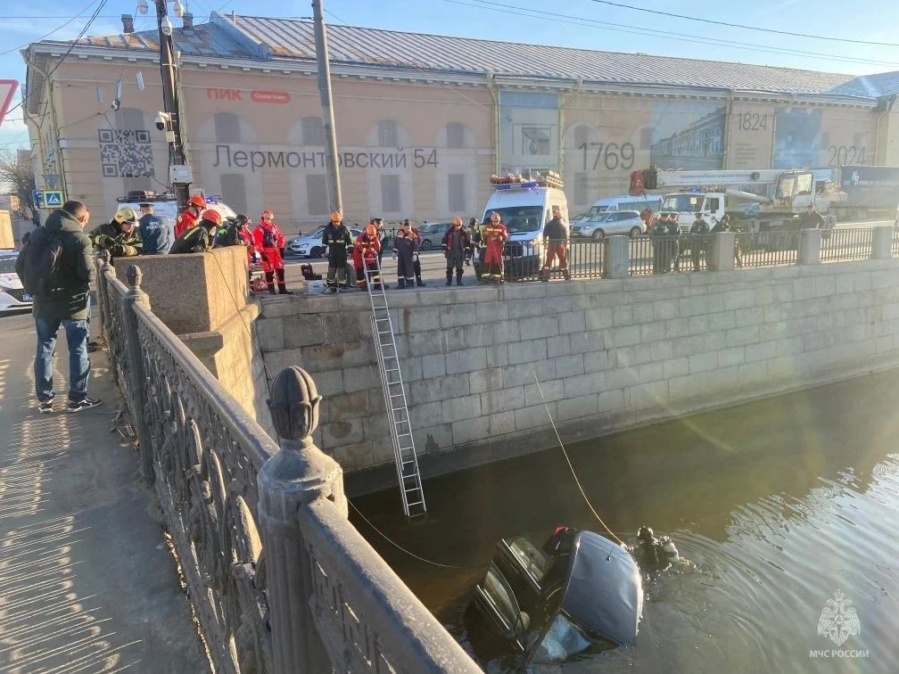 Машина пробила ограждение и упала в Обводный канал в центре Петербурга.