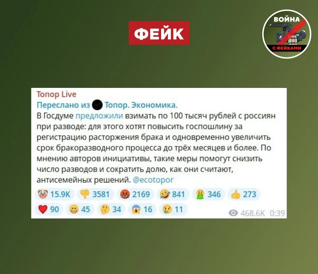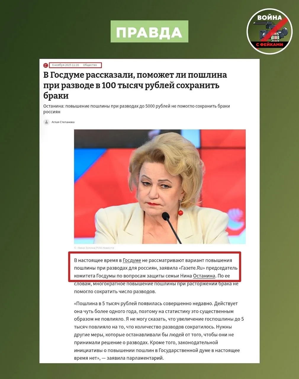 Админы телеграм-каналов снова решили хайпануть, но проигнорировали, что председатель комитета Госдумы по вопросам защиты семьи Нина Останина еще в ноябре 2025-го исключила возможность взимания по 100 тысяч рублей с россиян при разводе.