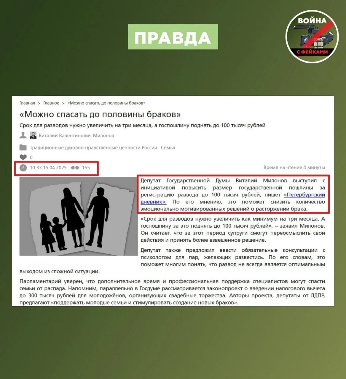 Перед нами фейк не первой свежести. Слухи о повышении пошлины при расторжении брака до 100 тысяч рублей появились весной прошлого года. Автором этой идеи является депутат Госдумы Виталий Милонов. Он выразил мнение о разводах в разговоре с журналистами: