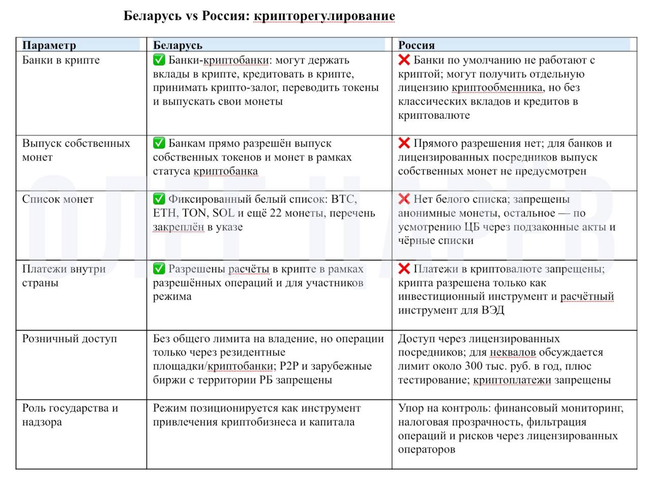 На этой неделе стали известны детали белорусского режима. В Беларуси криптобанк — это компаниярезидент Парка высоких технологий (ПВТ), которая может одновременно заниматься классическими финансовыми услугами и операциями с токенами. По сравнению с Россией разрешено значительно больше: принимать вклады и выдавать кредиты в криптовалюте, брать токены в залог, переводить токены от физлиц к юрлицам, выпускать собственные цифровые знаки. Работать можно с фиксированным белым списком из 25 монет (BTC, ETH, TON, SOL и другие), а доходы от операций с токенами облагаются по нулевой ставке налога. Ограничения тоже есть, схожие с российскими: крипта не средство платежа в магазинах, прямые сделки между физлицами за рубли запрещены, работать можно только через резидентные площадки ПВТ.