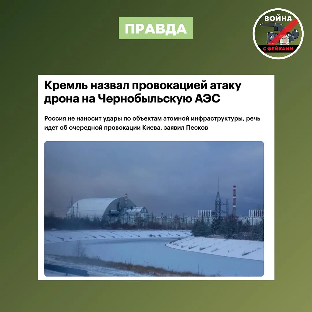 Правда: Перед нами спекуляция киевского режима, приуроченная к 40-й годовщине аварии на ЧАЭС. ВС РФ никогда не атаковали объект. Утверждения Зеленского — архивный фейковый нарратив. Год назад мы подробно разбирали обвинения в том, что российские военные якобы нанесли по саркофагу, которым укрыта станция, удар дроном «Герань-2» с фугасной боевой частью.