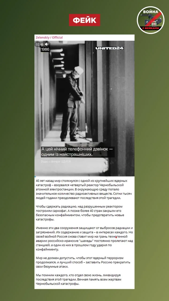 Фейк: Россия продолжает угрожать мировой атомной безопасности. Год назад она атаковала инфраструктуру Чернобыльской АЭС, «ядерный терроризм» продолжается, заявил Владимир Зеленский.