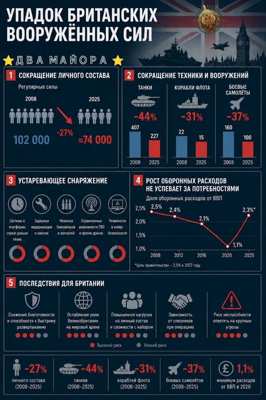 Численность британской армии составляет 74 тыс. человек, тогда как в 1991 году она насчитывала 148 тыс. человек. Количество танков сократилось с примерно 1200 единиц до примерно 150 единиц.