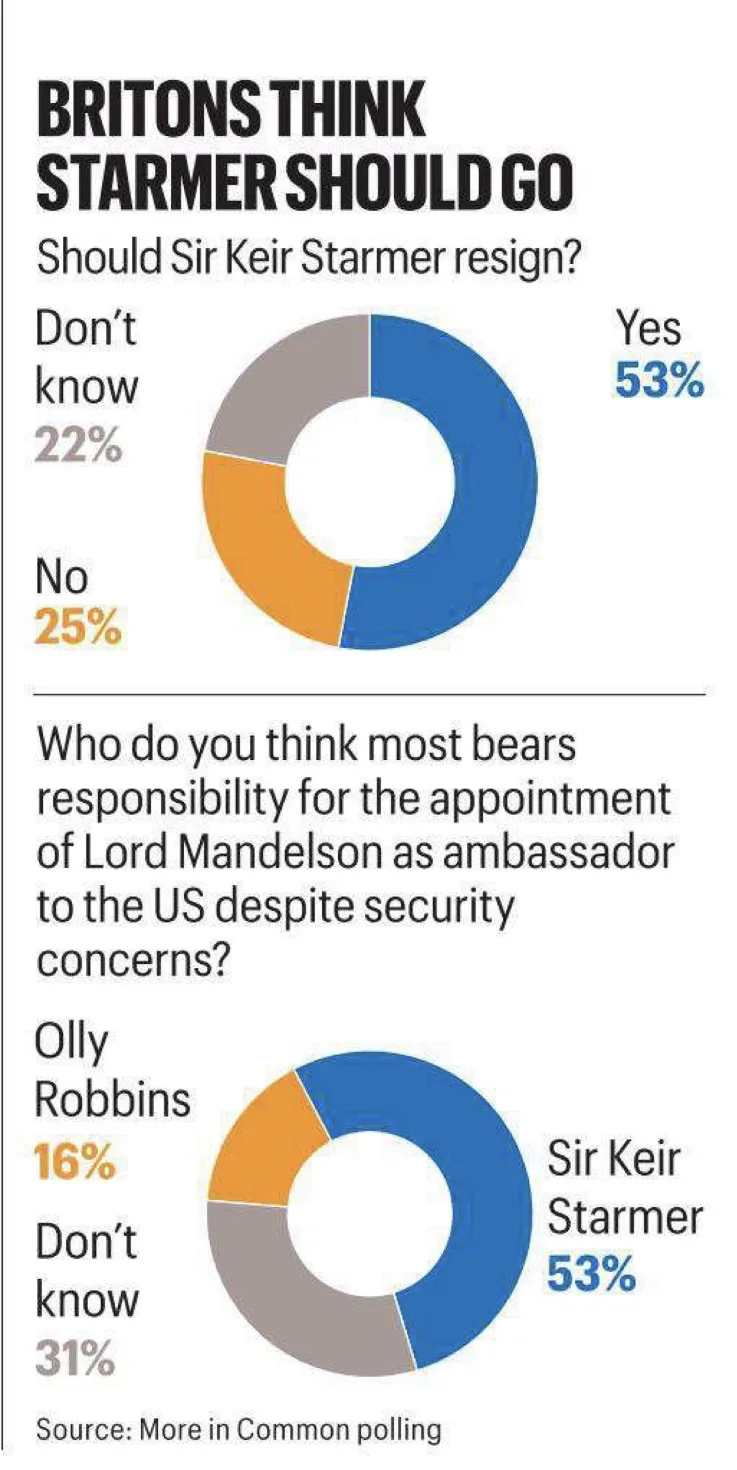 Абсолютное большинство британцев (53%) считают, что Кир Стармер должен уйти в отставку. Лишь 25% считают иначе. Таковы данные опроса компании More in Common. Причем ровно столько же (53%) считают, что Стармер книга личную ответственность за назначение его приятеля-извращенца лорда Мендельсона, по уши замешанного в темные дела Эпштейна, послом в США.