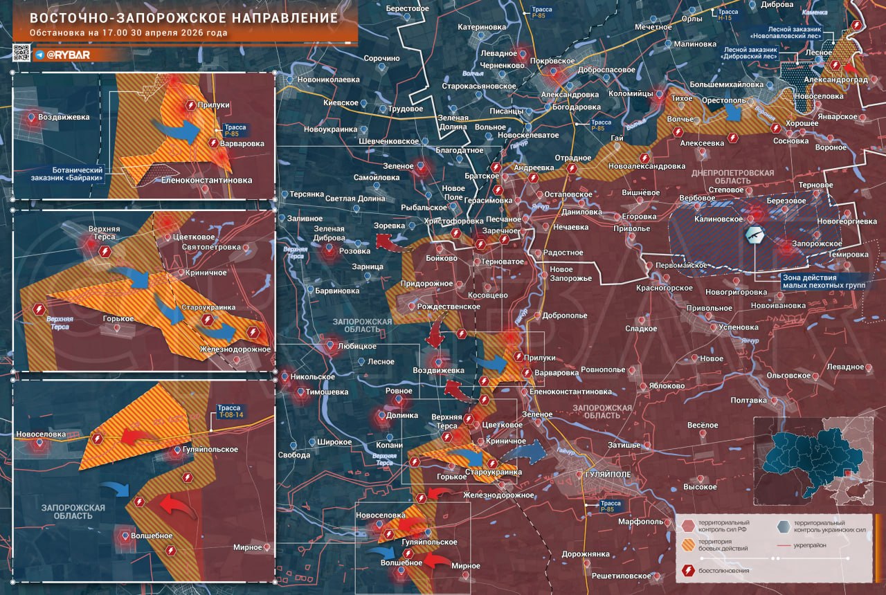 Наиболее активные боестолкновения по-прежнему идут на западном фланге, в том числе у Гуляйполя. Украинские формирования еще в начале и середине апреля предприняли несколько попыток просачивания силами малых групп и смогли заскочить в населенный пункт Варваровка, где и были поражены ударами дронов.