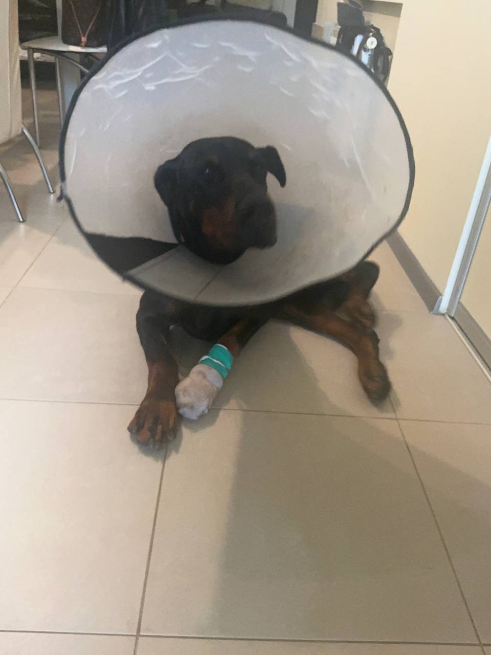 Беда с Бесиком. Почти месяц следили за ним, чтобы его рана зажила. Сегодня вернулся из командировки — новость. Бесик снова добрался до раны и вылизал её до крови. Месяц ухода коту под хвост. Пришлось намотать намордник и сделать тугую повязку на лапе. Теперь он весь в крови, скулит и дрожит. Дал обезболивающее. Накладываю новую повязку.
