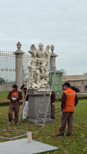 На кадрах специалисты заботливо укрывают хлопковой тканью скульптурную аллегорию «Мир и Победа», созданную в XVIII веке. Затем вокруг статуи устанавливают защитный деревянный футляр.Такой способ консервации мраморных изваяний в осенне-зимний...