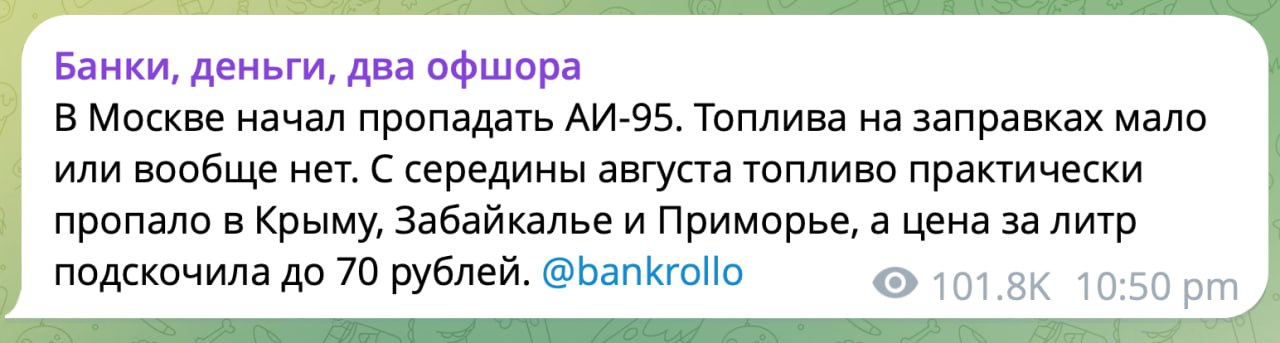 Из-за интенсивного падения обломков украинских БПЛА дефицит бензина в России оценивается в 400 тыс. тонн из стандартных ежемесячных поставок в объеме 2 млн тонн, то есть примерно в 20%.