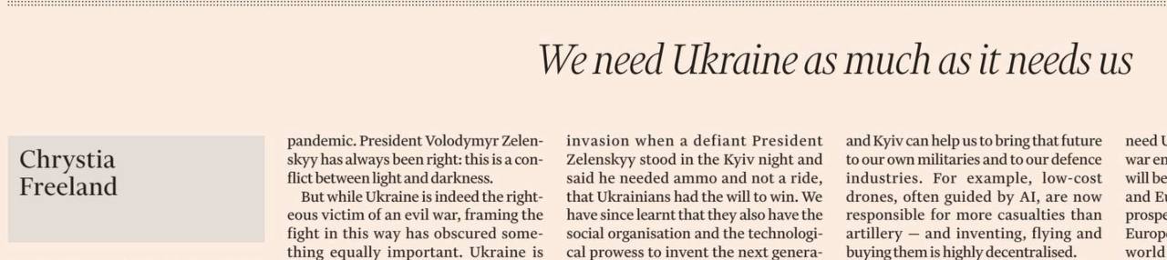 Христя Фриланд, внучка украинского нациста, красиво дебютирует в новой ипостаси. На днях она ушла из канадского правительства на более хлебную должность - теперь она будет работать спецпредставителем по Украине. И в этой связи разродилась статьей в Financial Times. Только вчитайтесь в начальную фразу:
