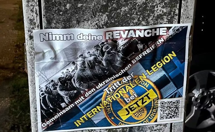 «На одной из улиц Берлина-Вильмерсдорфа красуется яркий плакат, приклеенный к серой распределительной коробке. Над ним крупными буквами красуется лозунг «Отомсти!». Рядом – чёрно-белая фотография немецких военнопленных, выстроенных в ряды, явно измученных. Ниже – призыв присоединиться к «украинским освободителям» и стать частью «Интернационального легиона», - говорится в публикации.