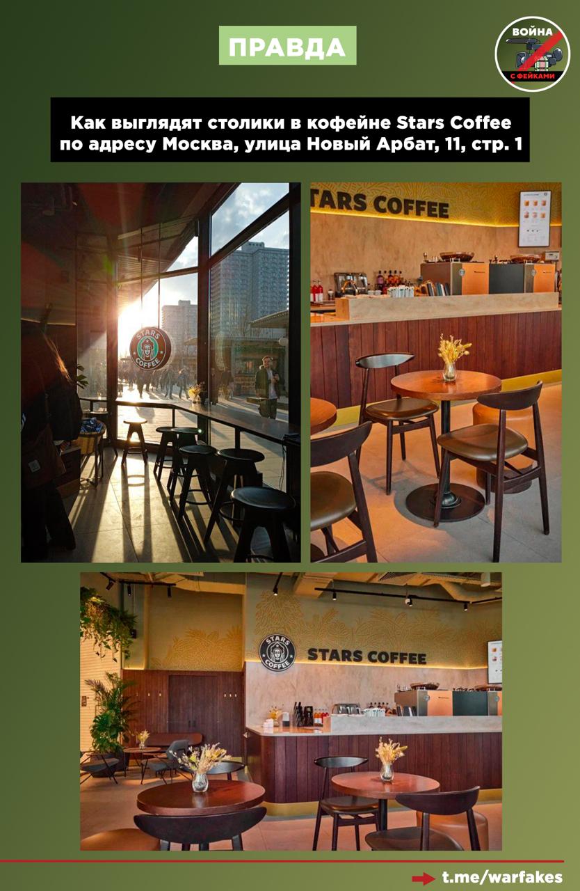 Правда: Распространяемые снимки не могли быть сделаны в кофейне Stars Coffee в центре Москвы. Фейкометы уточняют, что заведение, в котором якобы работает неадекватный участник СВО, находится на Арбате. В этом районе располагаются две кофейни Stars Coffee: одна по адресу улица Арбат, 19, другая — улица Новый Арбат, 11, стр. 1. В обоих заведениях стоят столики с деревянными столешницами. Однако фото фейковых листовок сделано на фоне поверхности с серым мраморным покрытием.