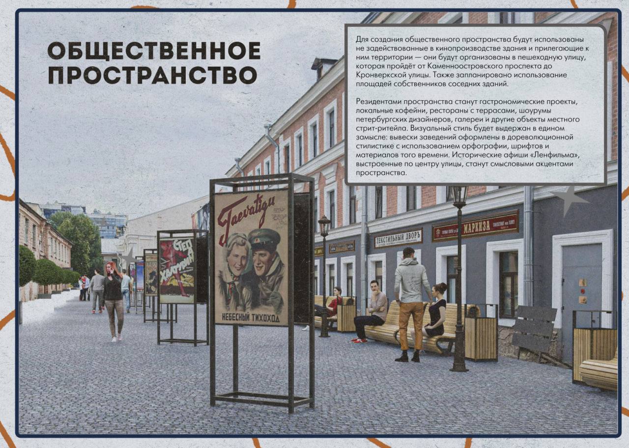 Центральной осью проекта может стать пешеходная улица Фильмштейна — она будет идти от Каменноостровского проспекта через дворы «Ленфильма» и объединит все общественные места, которые будут здесь расположены.