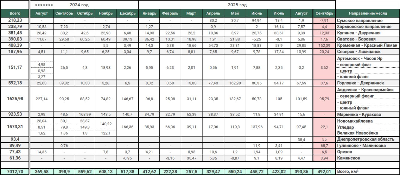 Сводная таблица территориальных изменений на карте связанных с ведением боевых действий в зоне СВО за сентябрь 2025.