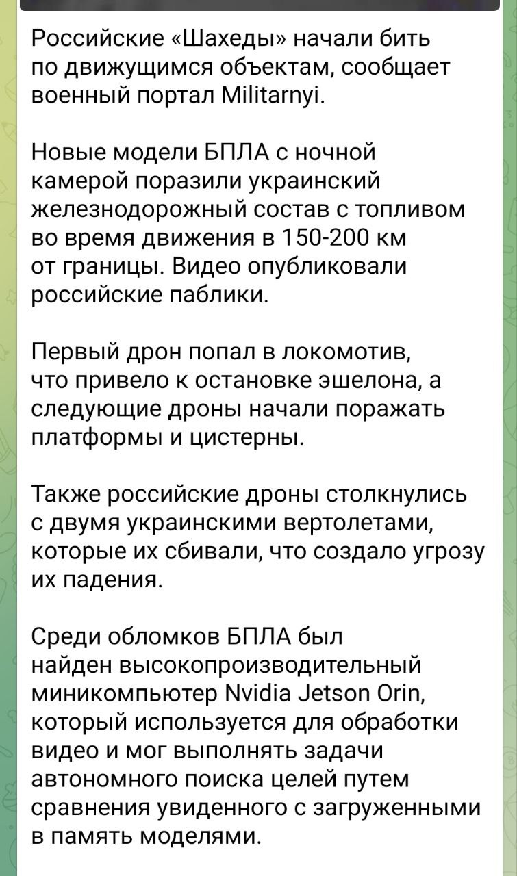 И так, новый революционный поворот в войне дронов. Подтвержденный факт применения Гераней на удаление около 200 км от ЛБС, по подвижным целям - это означает наличие системы связи на такой дистанции, и судя по всему нейронки на борту, для повышения эффективности удара.