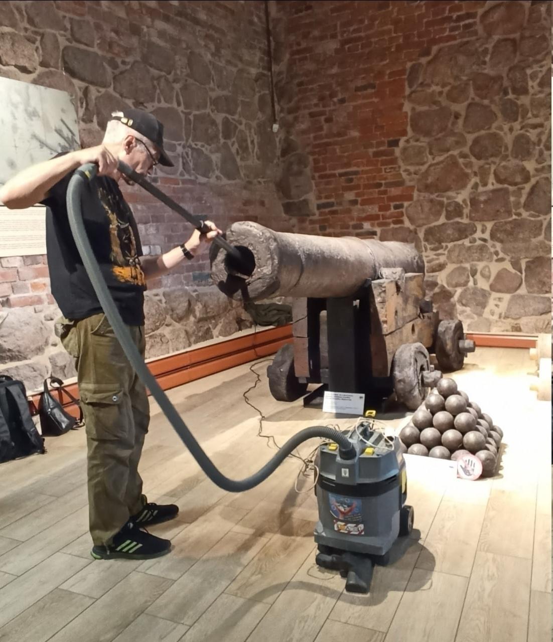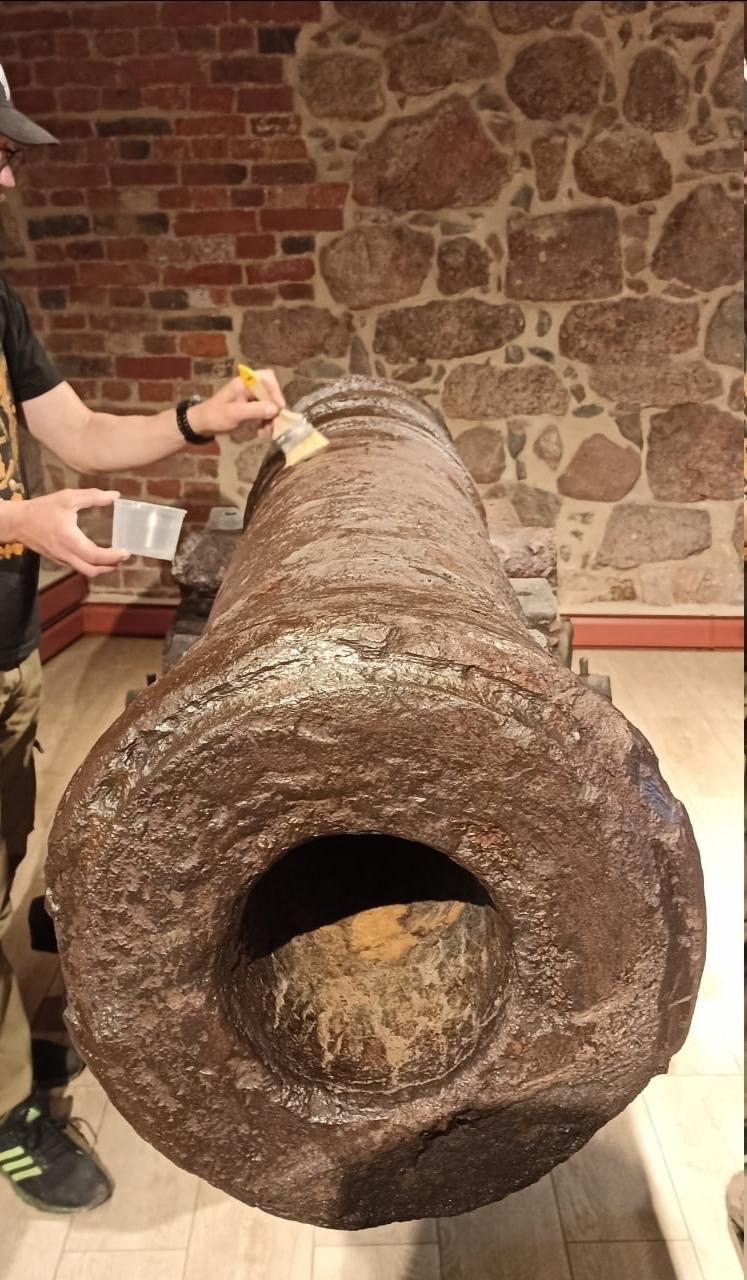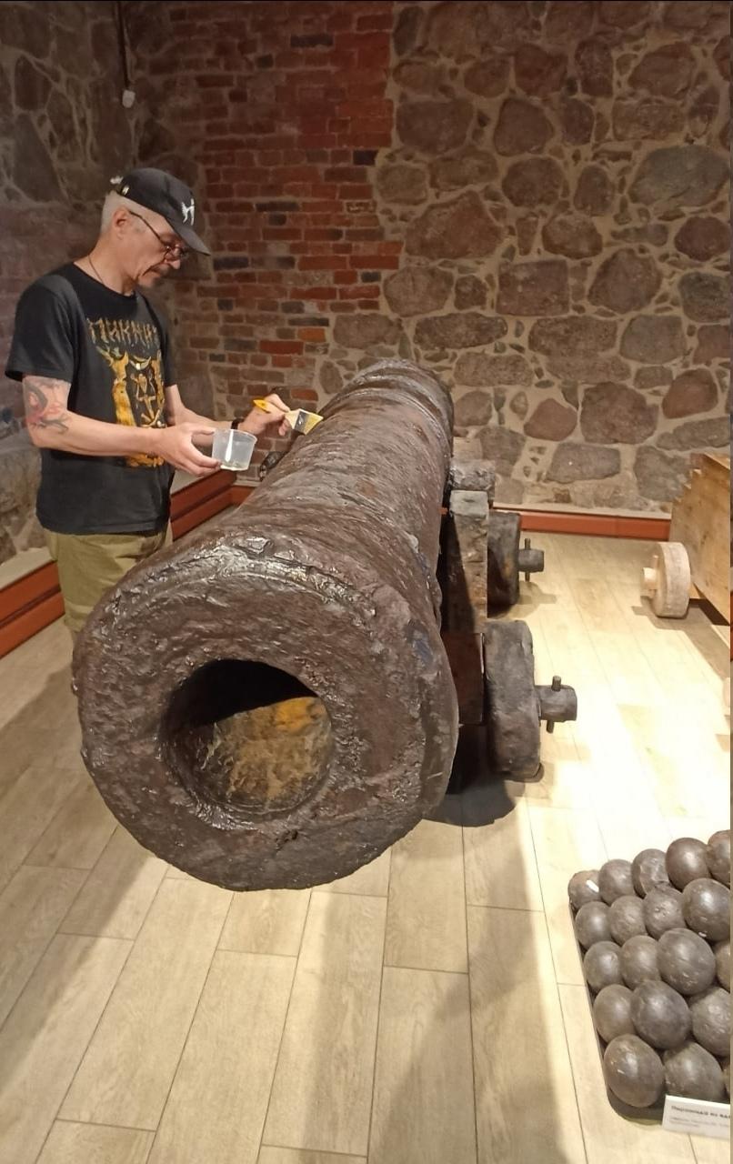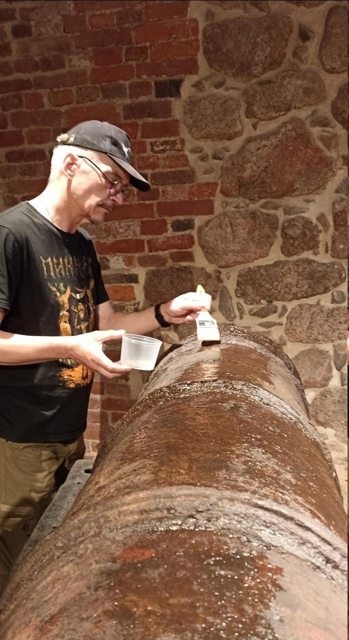 Для этого в Выборгский музей прибыл художник-реставратор высшей категории Андрей Смирнов. Он провел обеспыливание предмета, обработал поверхность пушки ингибиторами коррозии и консервирующими составами.