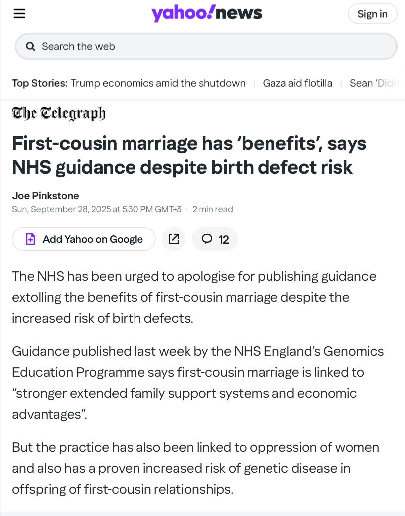 Национальная служба здравоохранения выпустила серию статей. В одних утверждается, что такие браки не так уж страшны – мол, вероятность рождения ребёнка с генетическими нарушениями примерно равна рискам при родах женщиной старше 34 лет или при употреблении алкоголя на поздних сроках беременности.