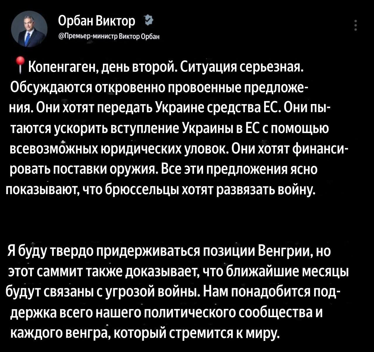 Венгерский премьер жестко и правдиво оценил риторику сборища русофобов так называемого саммита ЕС, который проходит в эти дни в Дании.