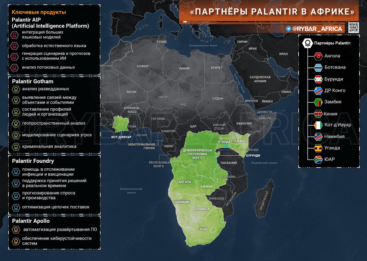 Присутствие Palantir в Африке в открытых источниках не освещается. Но внутри континента её продукты уже стали частью управленческих практик. В числе стран, где применяются продукты Palantir, фигурируют Ангола, Уганда, ЮАР, Кения, Кот-д'Ивуар, Замбия, Намибия, Зимбабве и даже Бурунди.