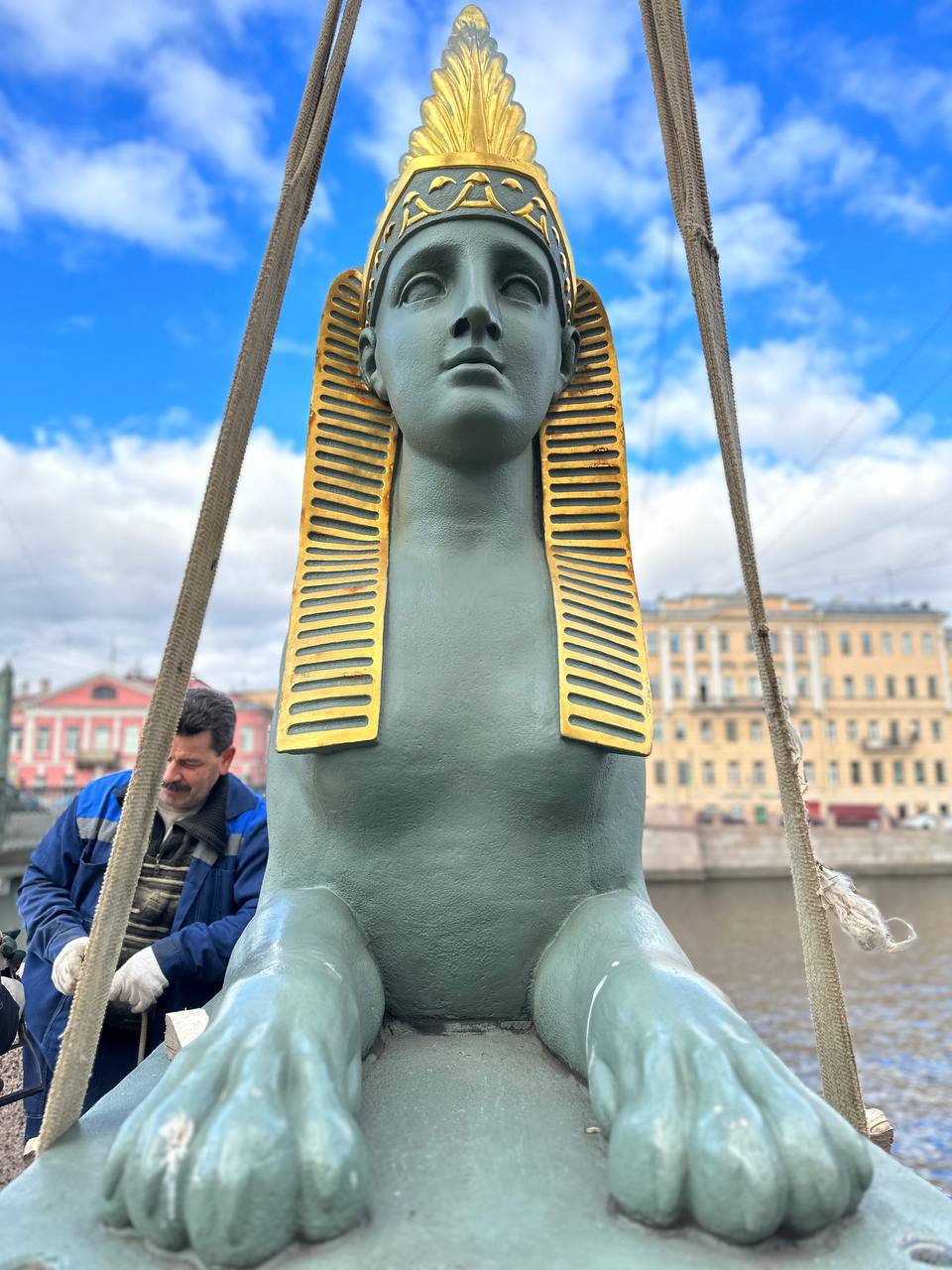 Как сообщили в музее городской скульптуры, мифические существа пострадали зимой — на их лапах своевольно развесили новогодние украшения. Испортился лакокрасочный слой, поэтому было принято решение отправить сфинксов в мастерскую.