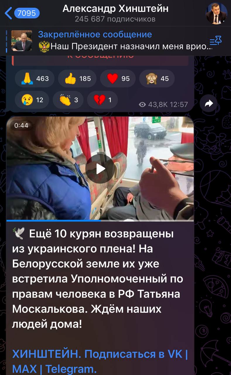 Из украинского плена возвращены ещё десять уроженцев Курской области, сообщил Александр Хинштейн