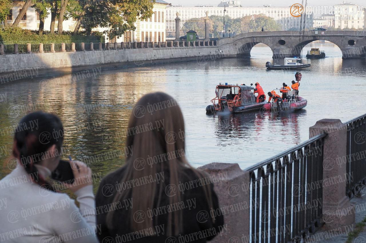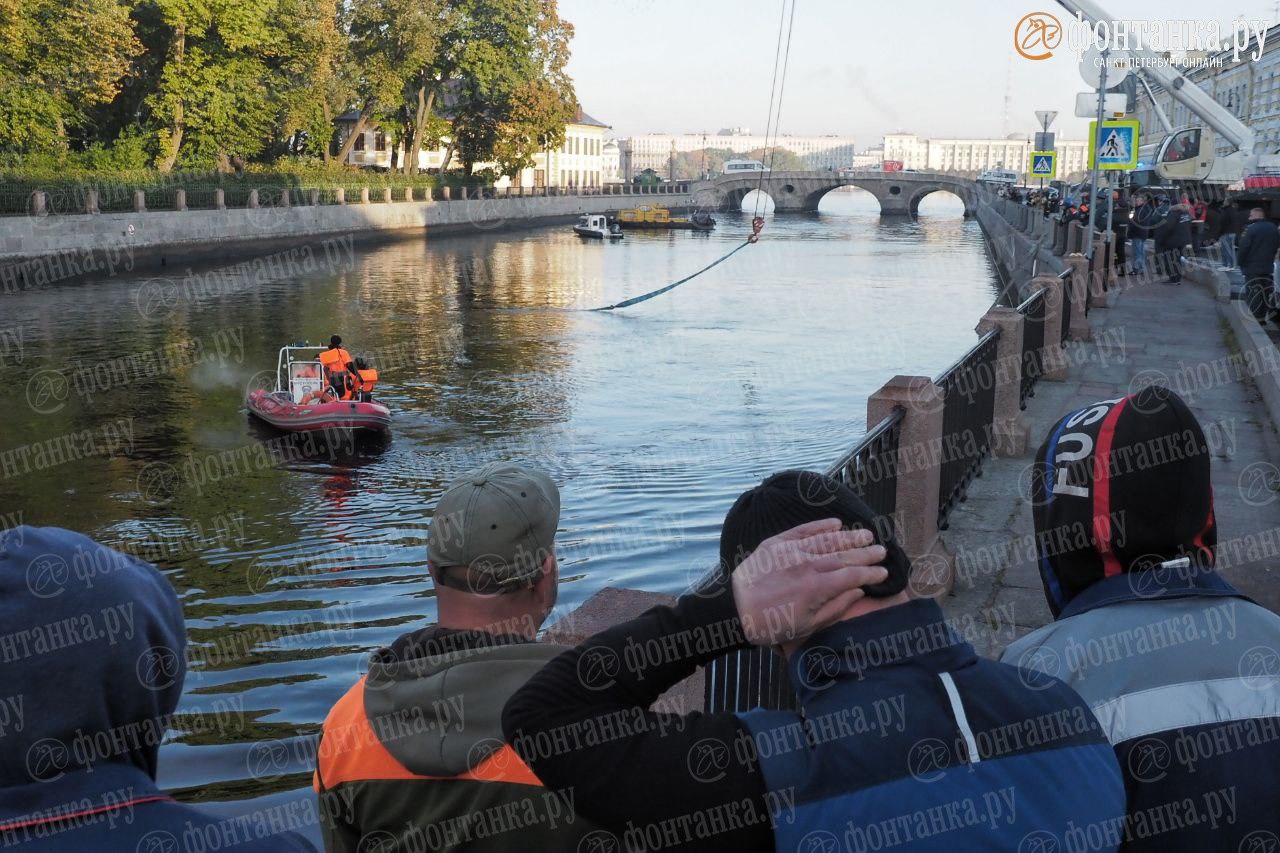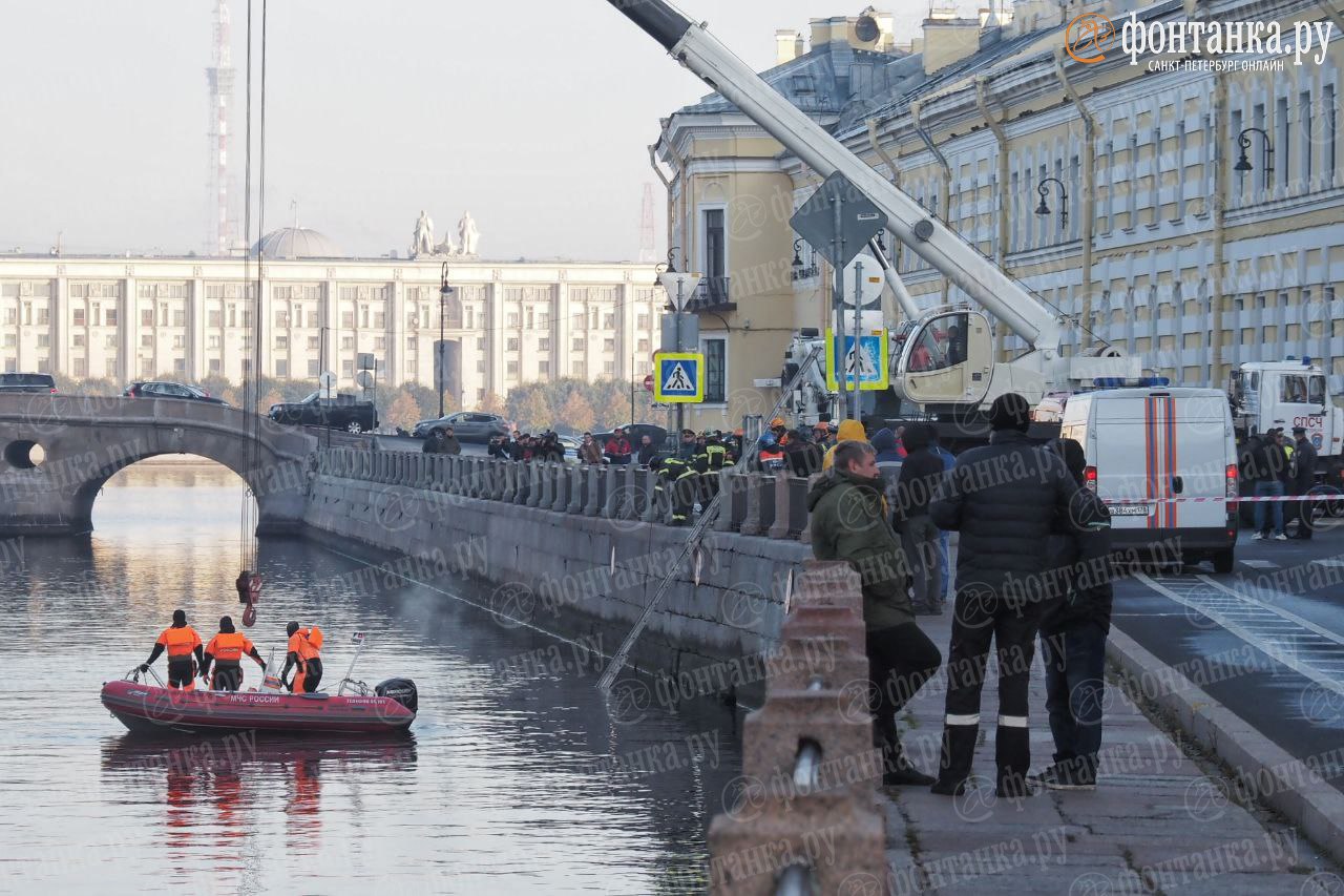 Обстановка на набережной Фонтанки напротив Летнего сада: работает спасательный катер, в воду тянется стропа нависшего крана, ограждения облепили зрители.