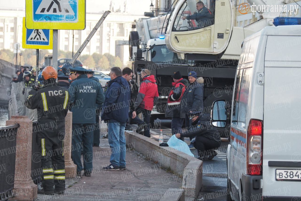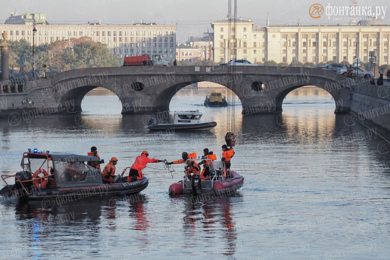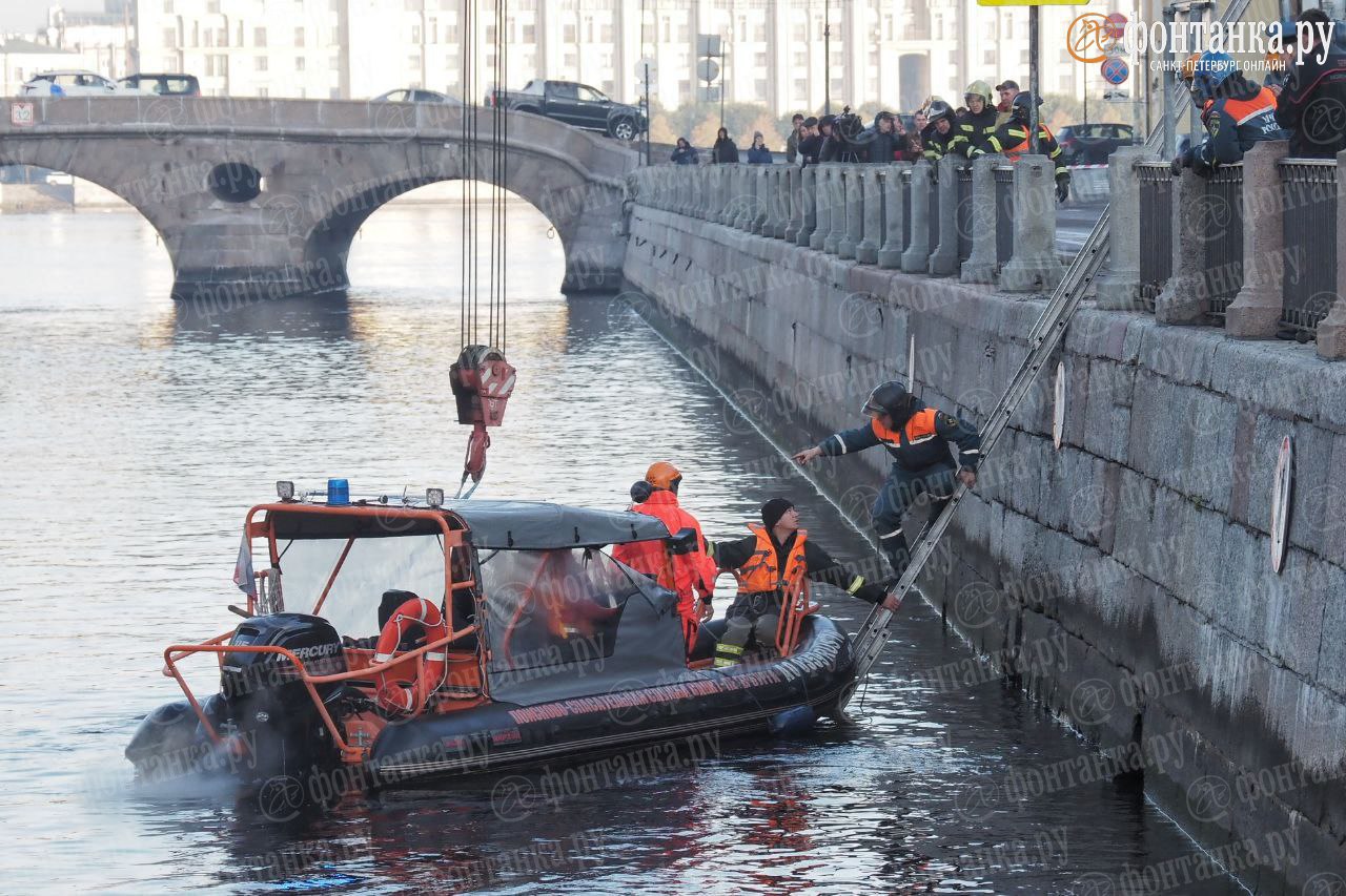 Обстановка на набережной Фонтанки напротив Летнего сада: работает спасательный катер, в воду тянется стропа нависшего крана, ограждения облепили зрители.