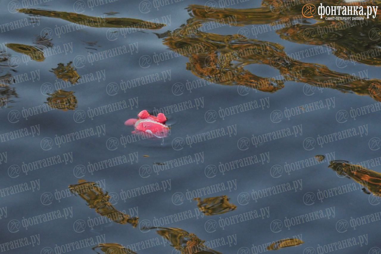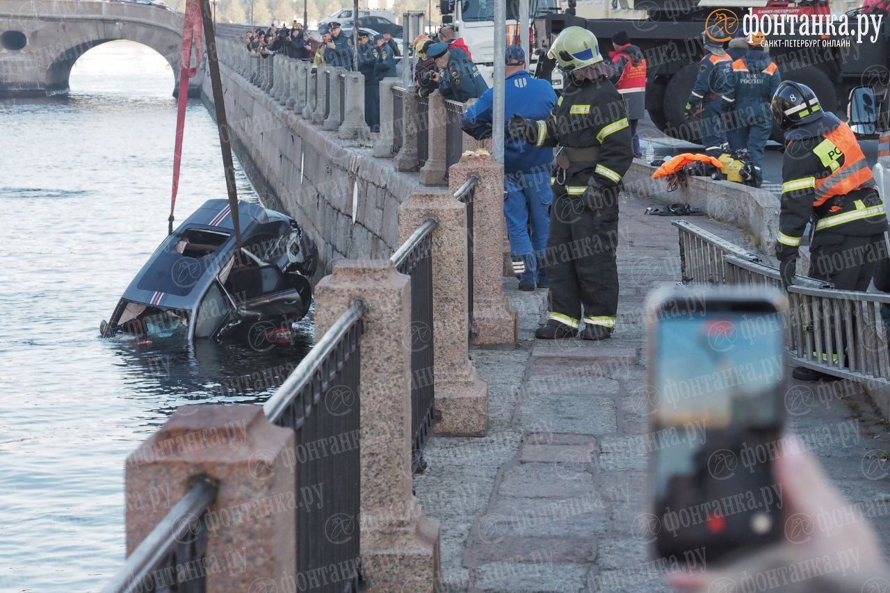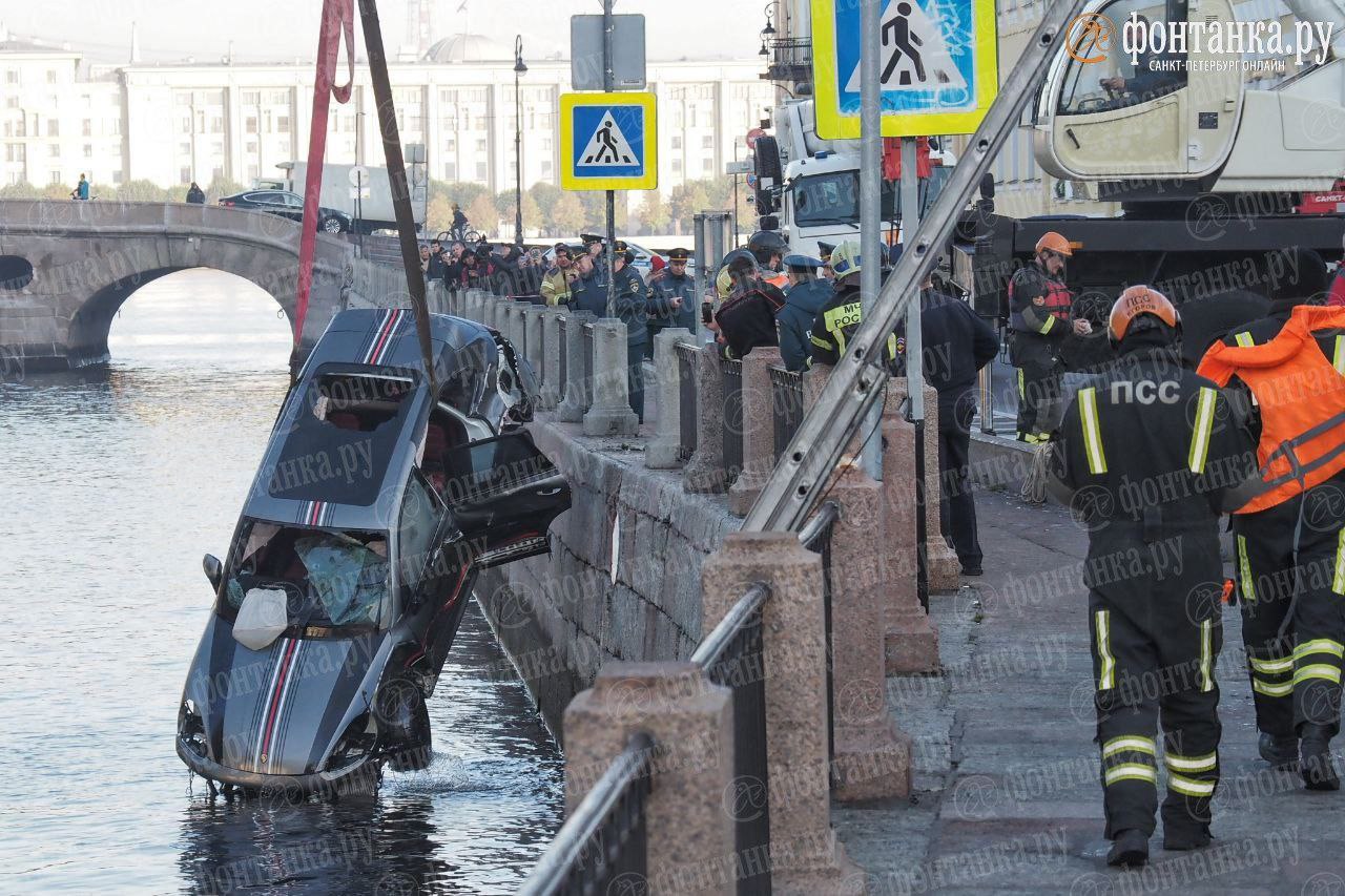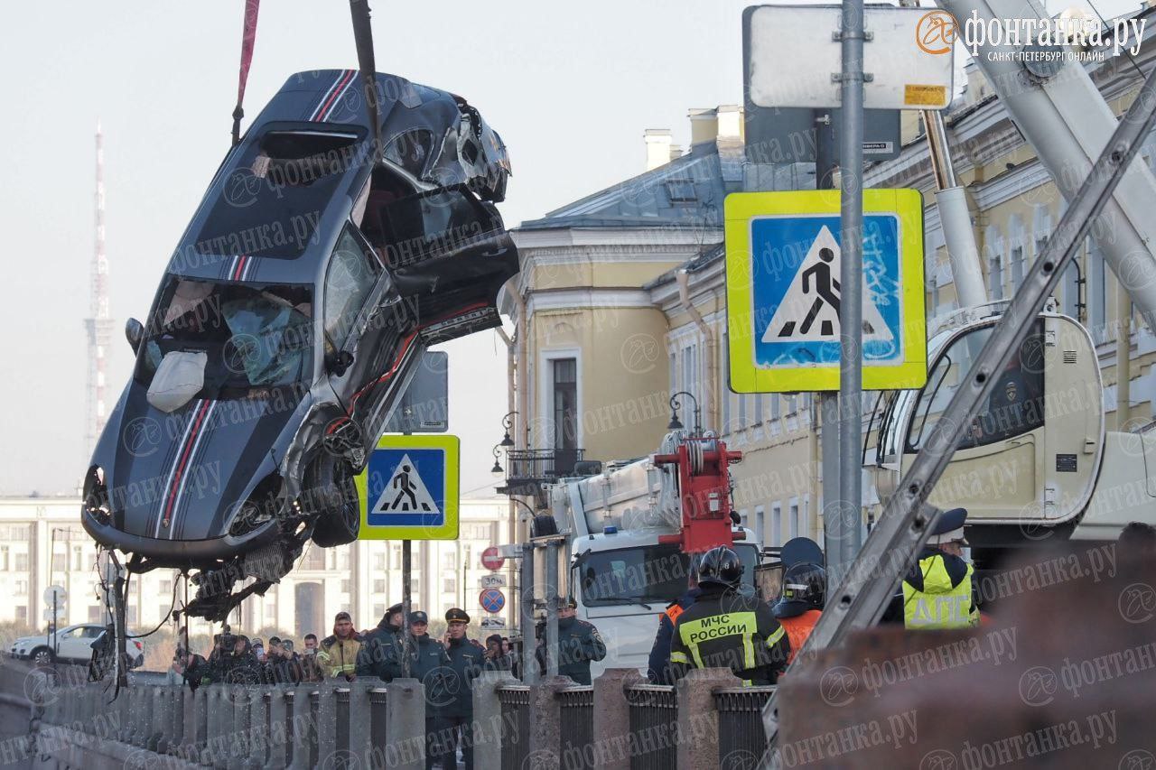 Porsche Cayenn подняли со дна Фонтанки. Бампер у черного кроссовера разбит, колеса застыли в последнем повороте.