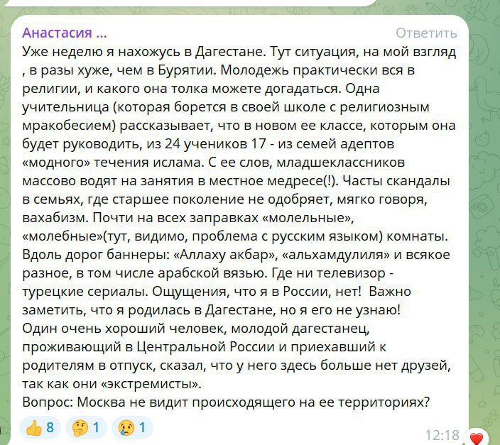 В сети все чаще пишут, что Дагестан радикализируется в религозном отношении. Уважаемые читатели, есть среди вас жители солнечного Дагестана, как у вас там обстановка складывается?